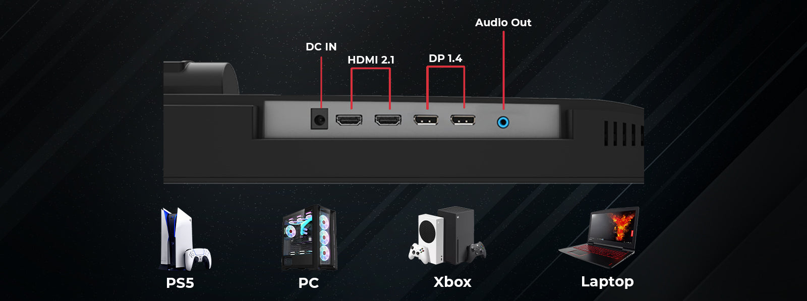 - Ports I/O : 2 x HDMI 2.1, 2 x DP 1.4, sortie audio